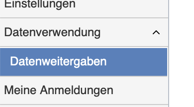 Klicke auf 'Datenweitergaben'. (Sollte der Menüpunkt nicht verfügbar sein, dann klicke erst auf Datenverwendung. Der Menüpunkt sollte anschließend sichtbar sein.)